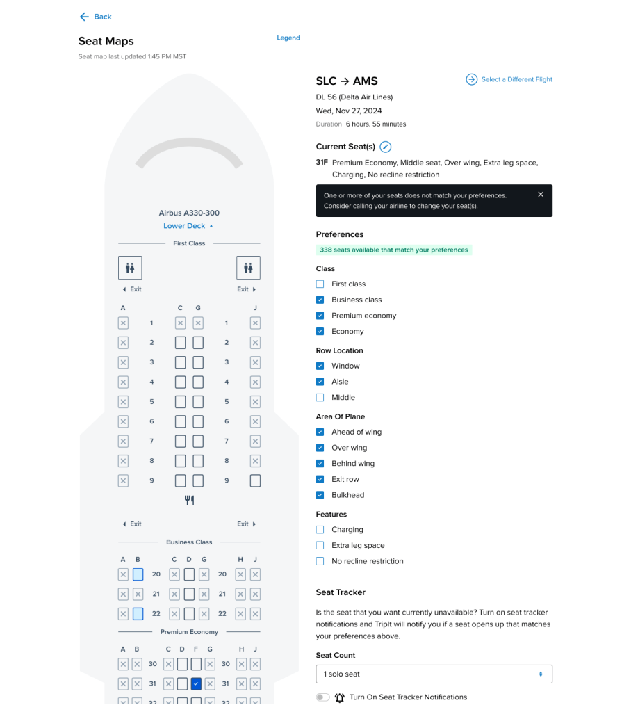 TripIt’s legacy “Seat Tracker” feature was designed to solve a universal travel anxiety: getting stuck in a bad seat. However, the execution was fundamentally flawed. It operated as a “black box” alert system that bombarded users with frustrating notifications for seats that were almost always gone by the time they called the airline. For the major TripIt Web redesign, I led the strategic pivot to transform this broken alert system into “Seat Maps”—a dynamic, interactive visual experience that gave power and autonomy back to the user, successfully launching on Web before achieving cross-platform parity on native mobile.