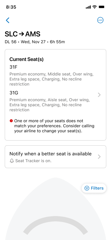 • The Hybrid Solution: Because we didn’t want to remove a legacy “Pro” feature, we didn’t kill the alert system entirely. Instead, we folded it into the new visual experience. If a user looked at the live map and saw their perfect seat was taken, they could seamlessly toggle the Seat Tracker on right from that screen, using their applied filters as the alert criteria.